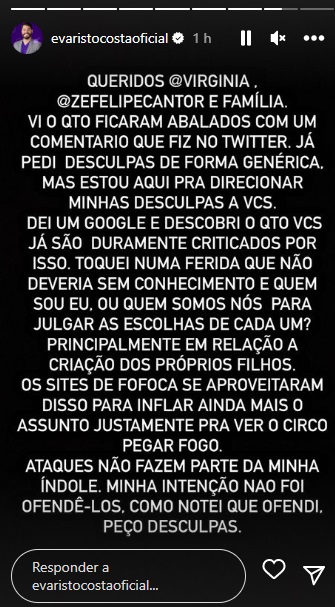 Evaristo Costa voltou a comentar sobre a polêmica envolvendo seu comentário contra Virgini Fonseca e Zé Felipe. Desse modo, por meio dos stories, pediu desculpa a influenciadora e toda a sua família.