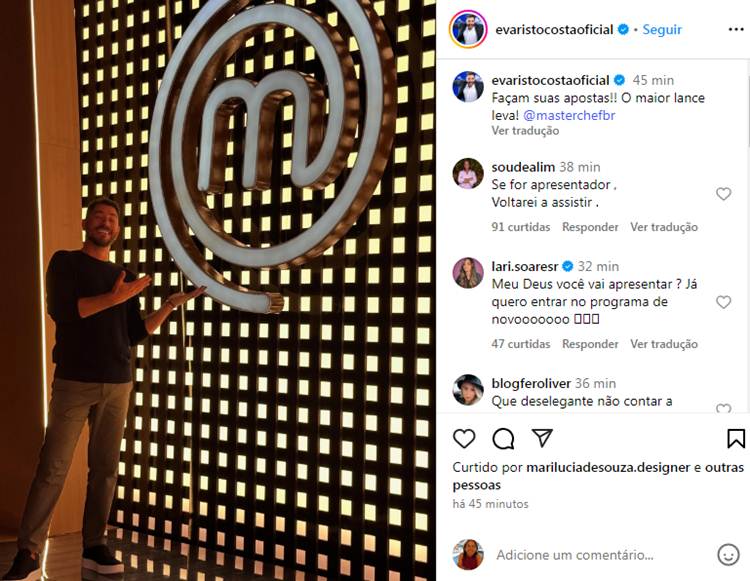 Evaristo Costa deixou os fãs agitados nesta sexta-feira (16). O apresentador publicou um post em seu perfil no Instagram e fez mistério. Ele apareceu ao lado da logo marca do Master Chef Brasil, da Band.