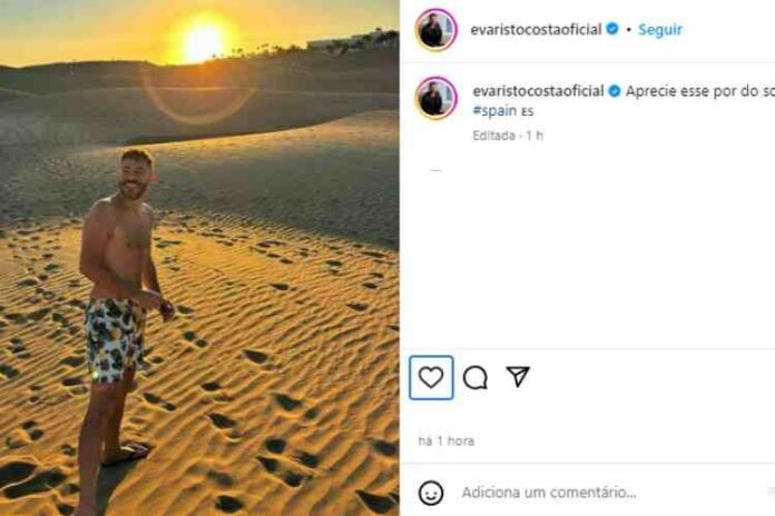 Na imagem, Evaristo aparece sem camisa e com uma bermuda estampada em meio a um belo cenário de dunas de areia e sol. O ex-titular do ‘Jornal Hoje’, da TV Globo, dividiu o clique com os seguidores no feed do Instagram, onde ele também fez um pedido ao público da rede social: “Aprecie esse pôr do sol. Espanha!”, escreveu o artista, na legenda da publicação.