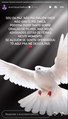 Em sua conta oficial do Instagram Stories, o ex-Global disse que não quer polemizar mais ainda o assunto. Porém, nas entrelinhas percebe-se um tom de ironia ao falar sobre criação dos filhos e ‘férias de seus advogados’. Ele enfatiza: ”Sou da paz. Não polemizem onde não existe polêmica. Poderia dizer tanto sobre criação de filhos, mas meus advogados estão de férias neste momento. Se alguém se sentiu ofendido(a) tô aqui pra me desculpar”, comentou.