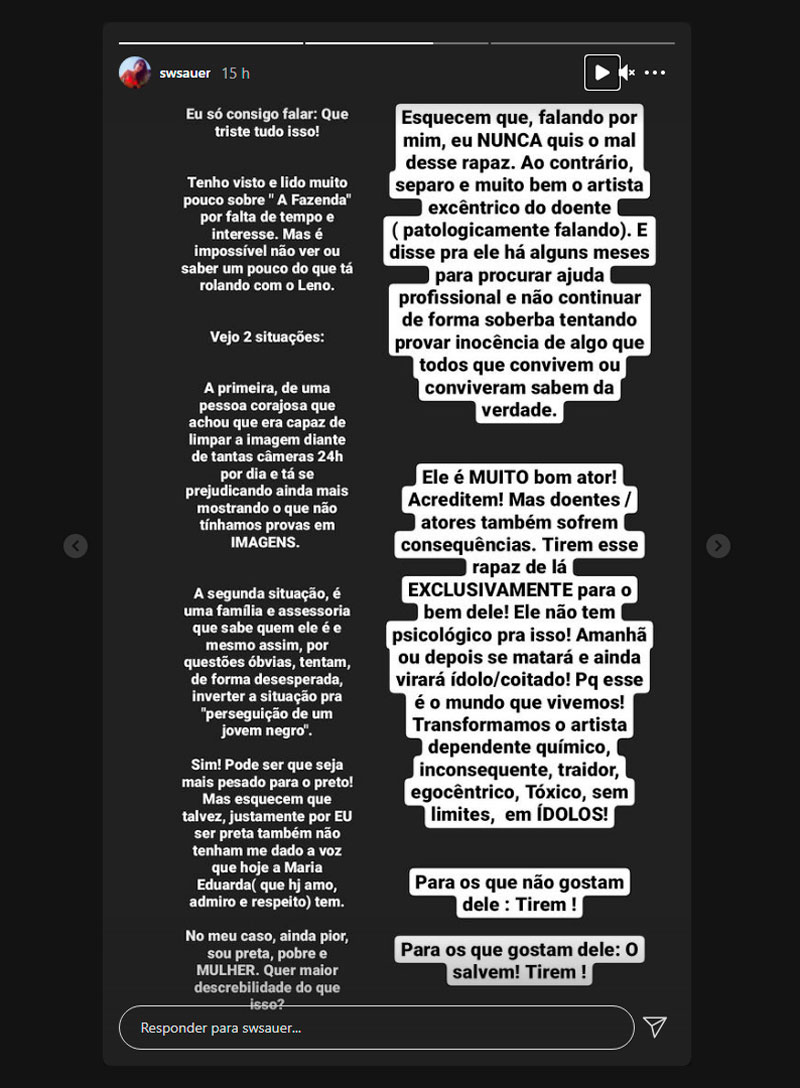 Sendo assim, ela continuou e revelou para seus seguidores que não acreditassem nas falas e nos jeitos do cantor no reality, pois segundo ela, ele é um bom ator. No entanto, ela prosseguiu pontuando que mesmo tendo uma boa atuação, os atores também sofrem consequências trágicas.