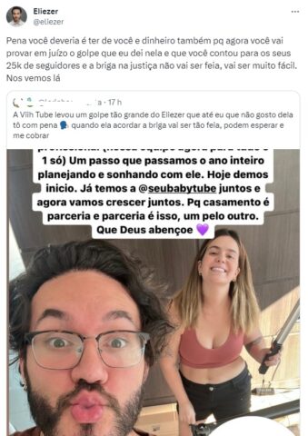 Após ser acusado de ter aplicado um golpe em Viih Tube por uma internauta, Eliezer usou seu perfil no X neste domingo (07) para rebater a crítica, afirmando que tomará medidas legais e que a pessoa terá que “provar” o que está dizendo.