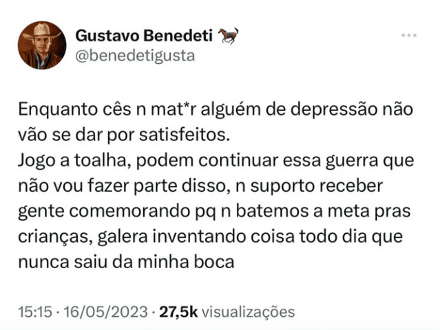 Na sequência, o ex-BBB reforçou que o recado não é para todos os seguidores, visto que possui uma parcela de fãs de bom coração. Após o desabafo, Benedeti desativou o perfil no microblog.