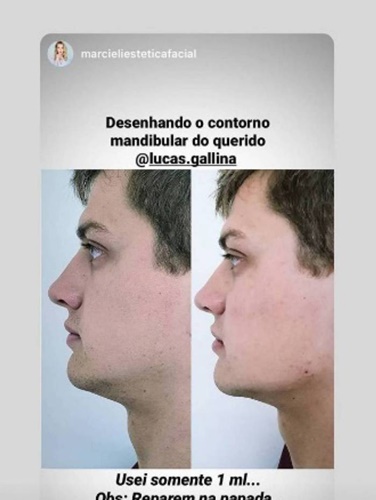 “A gente começou a fazer o contorno da mandíbula dele. Como ele nunca fez, tinha um pouco de receito de ficar com ela muito marcada, ficar com o rosto muito quadrado, então eu combinei com ele que vamos a fazer aos poucos. Coloquei somente 1 ml de cada lado, vamos deixar passar uma semana e depois entrar com mais. Na foto dá para ver que já começou a marcar um pouco o ângulo, já diminuiu a papada, mas fizemos tudo bem sutil. Fizemos um pouco de lábio também, ele não quer ficar com aquele muito forçado, nada muito marcado”, contou ainda a Dra. Marcieli Szyminovicz.