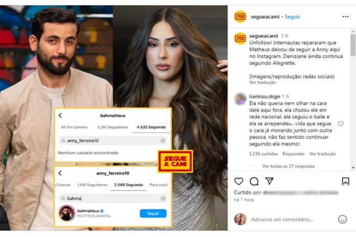 Passados quase dois meses após o término da atração, o gaúcho deixou de seguir Deniziane no Instagram, provocando a reação do público. Outro detalhe é que ela continua a segui-lo, apesar de ele ter engatado um relacionamento com Isabelle atualmente.