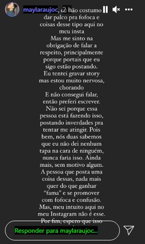 Nos stories do Instagram, a ex-BBB contou que estava nervosa com a situação, mas garantiu que a história não é verdadeira. “Gente, eu não costumo dar palco para fofoca desse tipo, mas me sinto na obrigação de falar a respeito, principalmente porque portais que sigo estão postando. Eu tentei gravar, mas estou muito nervosa, chorando, e não consigo falar, por isso preferi escrever”, escreveu.