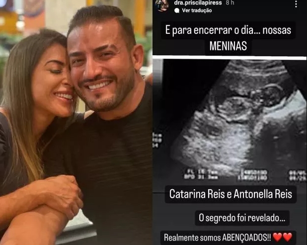Dessa forma, aos 39 anos de idade, Priscila Pires encantou seus milhares de seguidores ao divulgar a novidade por meio dos stories do Instagram. “E, para encerrar o dia, nossas meninas. Catarina Reis e Antonella Reis. O segredo foi revelado. Realmente, somos abençoados, João”, escreveu Priscila, ao compartilhar o ultrassom e contar o nome escolhido para as filhas.