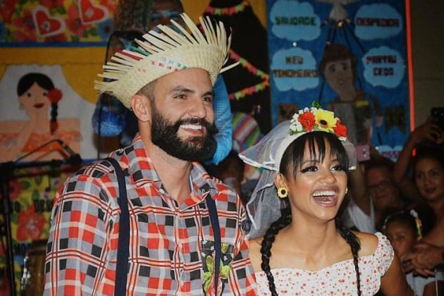 Eles, apesarem de serem os noivos, estavam vestidos de caipiras, e trocaram aliança e se beijaram no tradicional casório junino. Na ocasião, o público presente no local foi ao delírio.