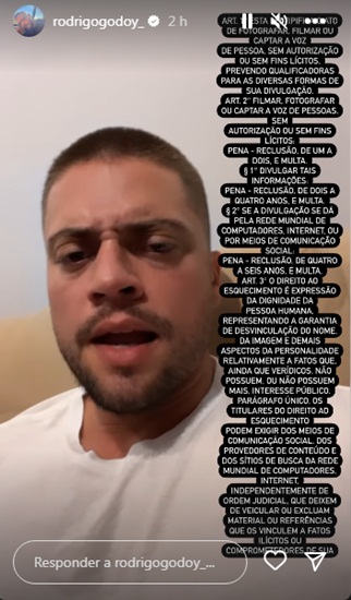 Godoy ainda colou ao lado um print de um artigo de Lei que proíbe filmar e fotografar pessoas sem autorização da mesma. “Isso aí é crime! Não sei se vocês vendem essas fotos dos outros aí de fofoca, mas quando vocês vendem por ‘X’ reais, os caras fazem R$50 milhões dando clickbait com a imagem dos outros. Bota uma legenda apelativa, não sei como vocês sabem como é que funciona a p*rra desse mercado, que é um lixo”, continuou.