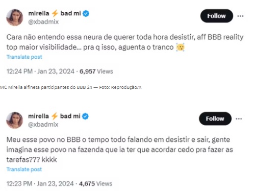 “Cara, não entendo essa neura de querer desistir toda hora. Aff, reality top, o maior em visibilidade… Pra que isso? Aguenta o tranco”, disse a funkeira. Mirella ainda comparou o reality com “A Fazenda”, exibido pela Record TV.