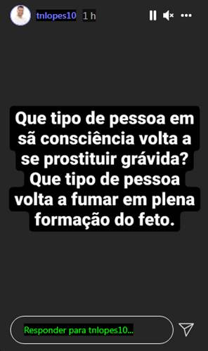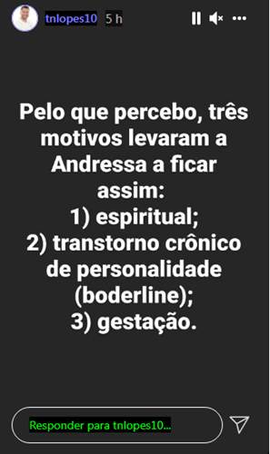 Antes, Thiago ainda comentou sobre o que pode estar levando a ex-mulher a ter esses comportamentos instáveis. “Pelo que percebo, três motivos levaram a Andressa a ficar assim: 1) Espiritual; 2) transtorno crônico de personalidade (boderline); 3) gestação”, pontuou.