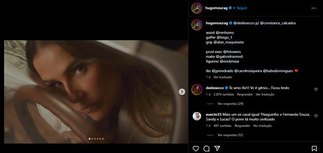 No perfil oficial do Instagram de Hugo é possível perceber imagens da famosa em um carro divulgando uma marca de calçados. Ao se deparar com a postagem do ex-esposo, Deborah disse o seguinte: ”Te amo Xe!!! Vc é gênio… Ficou lindo”, enfatizou a atriz.
