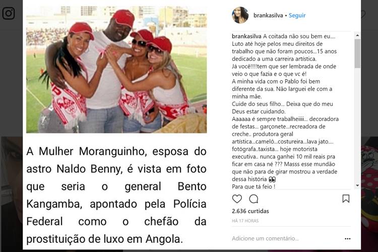 “A coitada não sou bem eu….Luto até hoje pelos meu direitos de trabalho que não foram poucos…15 anos dedicado a uma carreira artística. Já você!!!!tem que ser lembrada de onde veio o que fazia e o que vc é! A minha vida com o Pablo foi bem diferente da sua. Não larguei ele com a minha mãe. Cuide do seus filho… Deixa que do meu Deus estar cuidando. Aaaaaa é sempre trabalheiiii… decoradora de festas… garçonete…recreadora de creche.. produtora geral artística…camelô…costureira…lava jato…. fotógrafa..taxista… hoje motorista executiva.. nunca ganhei 10 mil reais pra ficar em casa né ??? Masss esse mundão que não para de girar mostrou a verdade dessa história. Para que tá feio!”, escreveu Branka.