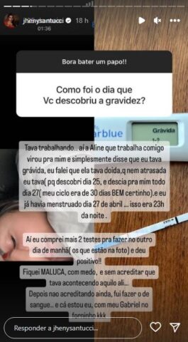 Em sua conta oficial do Instagram Stories, a ex-companheira de Arthur abriu uma caixinha de perguntas para interagir com seus seguidores. Dessa maneira, um usuário fez o seguinte questionamento: ”Como foi o dia que você descobriu a gravidez”, perguntou. A influenciadora comentou que estava no trabalho quando uma colega de profissão revelou que ela estava grávida.