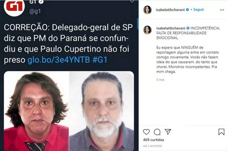 A ex-namorada do ator, que havia publicado um texto em sua conta oficial do Instagram nesta quarta-feira (28), comemorando a prisão, repercutiu o engano na prisão do próprio pai e rasgou o verbo contra a incompetência dos policiais para averiguação do caso. Ao trazer a notícia estampada na postagem, na legenda, Iasbela Tibcherani detonou.