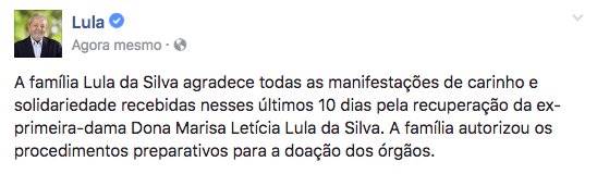“A família Lula da Silva agradece todas as manifestações de carinho e solidariedade recebidas nesses últimos 10 dias pela recuperação da ex-primeira-dama Dona Marisa Letícia Lula da Silva. A família autorizou os procedimentos preparativos para a doação dos órgãos“, diz o post.