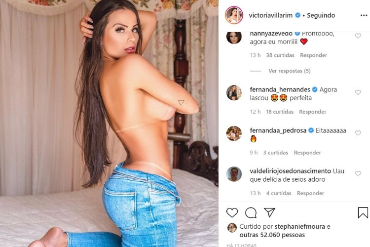 Na imagem, a modelo, que terminou o seu relacionamento com o cantor sertanejo Eduardo Costa no meio do ano passado, apareceu utilizando somente uma calça jeans. A parte de cima de seu corpo estava do jeito em que ela veio ao mundo. Victória Villarim cobriu parte do seu seio com a sua mão.