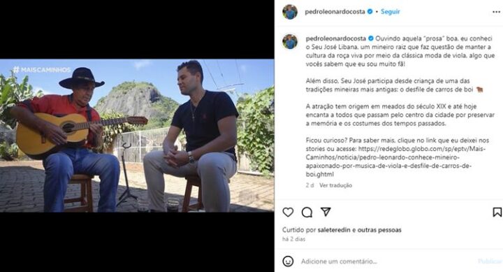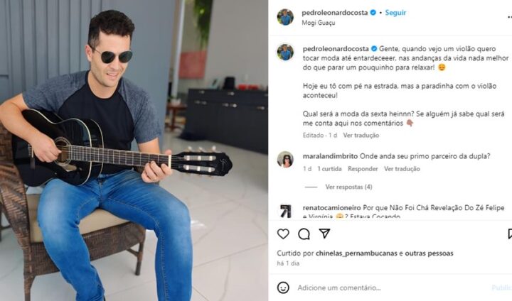 “Gente, quando vejo um violão quero tocar moda até entardeceeer, nas andanças da vida nada melhor do que parar um pouquinho para relaxar! Hoje eu tô com pé na estrada, mas a paradinha com o violão aconteceu! Qual será a moda da sexta heinnn? Se alguém já sabe qual será me conta aqui nos comentários“, quis saber ele, na publicação.