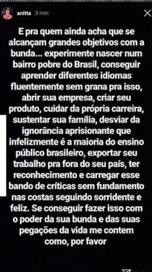 Horas depois, a cantora usou os stories de seu Instagram para rebater o comentário: “E para quem ainda acha que se alcançam grandes objetivos com a bunda… Experimente nascer num bairro pobre do Brasil, conseguir aprender diferentes idiomas fluentemente sem grana pra isso, abrir sua empresa, criar seu produto, cuidar da própria carreira, sustentar sua família, desviar da ignorância aprisionante que infelizmente é a maioria do ensino público brasileiro, exportar seu trabalho pra fora do seu país, ter reconhecimento e carregar esse bando de críticas sem fundamento nas costas seguindo sorridente e feliz. Se conseguir fazer isso com o poder da sua bunda e das suas pegações da vida me contem como, por favor”, disparou ela.