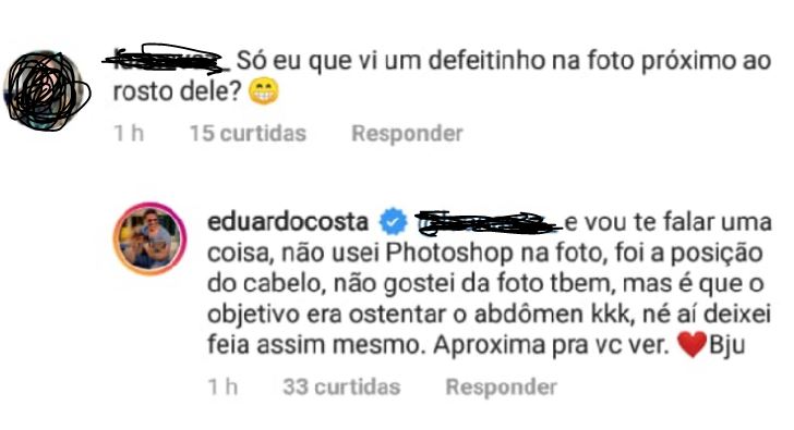 Nos comentários várias fãs elogiaram o corpo do cantor, no entanto, uma internauta chamou a atenção para um detalhe, até então desapercebido. É que a jovem percebeu que o rosto de Eduardo estava um pouco estranho, e ela acabou o acusando de ter editado a imagem. (Veja a foto abaixo)