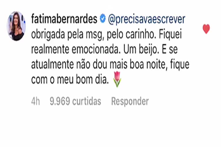 “Obrigada pela mensagem, pelo carinho. Fiquei realmente emocionada. Um bejo. E se atualmente não dou mais boa noite, fique com meu bom dia.“, escreveu a jornalista.