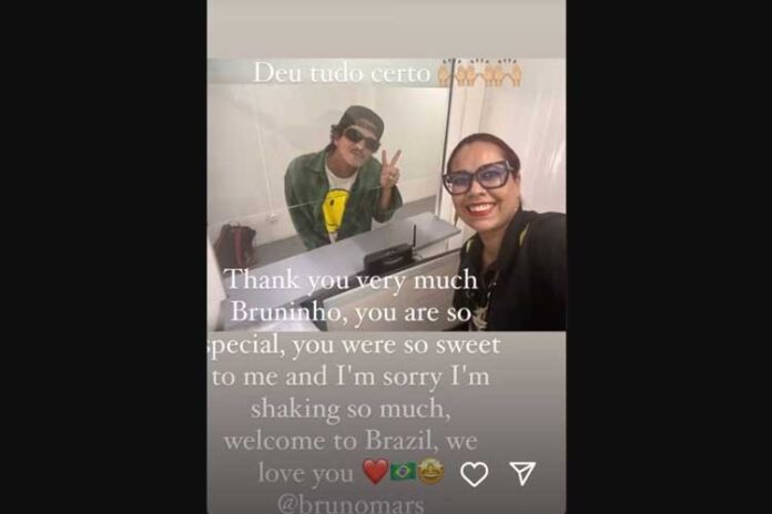 O cantor Bruno Mars desembarcou no Brasil nesta segunda-feira (30) e foi flagrado ao lado de uma fã em Stories compartilhados nas redes sociais. O artista irá realizar cerca de 14 shows no país, passando por locais como Belo Horizonte, Rio de Janeiro, São Paulo, Curitiba e Brasília.