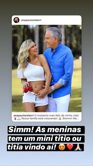 Após a notícia ganhar grande repercussão na web, Fabiana Justus, uma das herdeiras do empresário se pronunciou em suas redes sociais e comemorou a gravides de Ana Paula Siebert. Vale pontuar que Fabiana é mãe das gêmeas, Chiara e Siena.