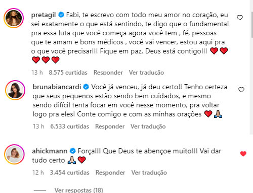 Preta Gil, que também enfrentou o câncer recentemente, comentou dizendo que Fabiana está em boas mãos e certamente conseguirá se curar. “Fabi, te escrevo com todo o meu amor no coração. Eu sei exatamente o que está sentindo. Te digo que o fundamental para essa luta que você começa agora você tem: fé, pessoas que te amam e bons médicos. Você vai vencer. Estou aqui para o que você precisar!!! Fique em paz. Deus está contigo!”, disse a cantora.