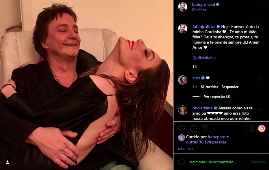 Em seu perfil no Instagram, Fábio Jr. publicou uma foto ao lado da filha. “Hoje é aniversário da minha Gordinha ❤! Te amo muitão filha ! Deus te abençoe, te proteja, te ilumine e te oriente sempre ! Amém Amor ❤”, escreveu na legenda.