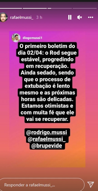 “Rodrigo Mussi segue estável, progredindo em sua recuperação. Ainda sedado, mas o processo de extubação normalmente é lento”, dizia o comunicado.