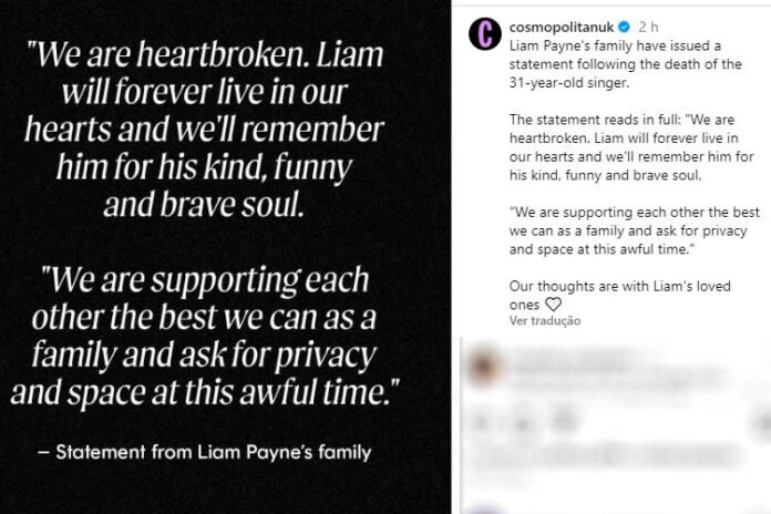 A família do ex-integrante do One Direction, Liam Payne, quebrou o silêncio e falou sobre a morte do cantor, ocorrida nesta quarta-feira (16), aos 31 anos, após ele cair da janela do quarto onde estava hospedado em Buenos Aires, na Argentina.