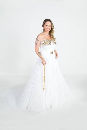 Fernanda Rodrigues – Fabíola Gouveia possui mais de 12 anos de experiência em confeitaria, além de ser co-apresentadora do programa Fazendo a Festa. Para o vestido da atriz e apresentadora ela utilizou mini flores de açúcar e um lindo e charmoso buquê de pirulitos.