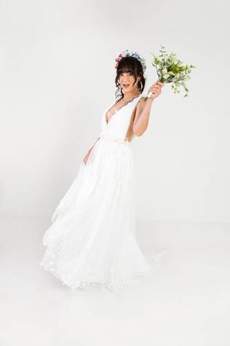 Dani Noce – Adalgisa Almeida tem um portfólio com mais de 27.000 bolos assinados por ela e sua equipe, além de diversos prêmios internacionais em confeitaria artística. Para o vestido da youtuber, ela confeccionou flores delicadas, aplicadas em toda a saia, uma guirlanda e buquê com misto de folhagens em açúcar.