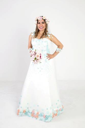 Taciele Alcolea – Rosangela Marinho é apaixonada pela decoração de bolos, tanto que diz que trabalha com o “lado doce da vida”. Presta serviços de consultoria, treinamento e ministra cursos de decoração artística de bolos. Para o vestido da youtuber confeccionou centenas de borboletas de papel arroz e o buquê e acessório em flores em pasta de açúcar.