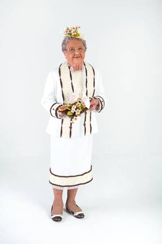 Palmirinha – Alexandre Bispo é chef chocolatier e carrega em seu currículo mais de 30 anos de experiência. Premiadíssimo, tem certificações em panificação e confeitaria internacional. Para o look da queridíssima Vovó Palmirinha utilizou rendas de papel arroz e camadas de chocolate para acabamentos na lapela do blazer e punhos além do buquê em chocolate e pasta de açúcar.