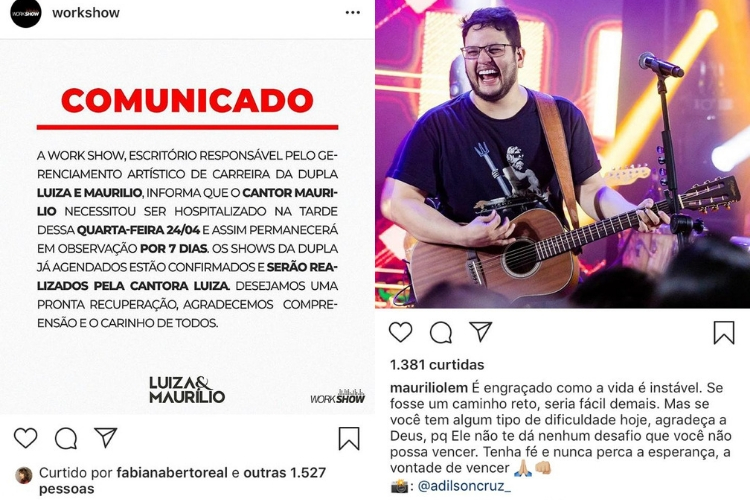 “A workshow, escritório responsável pelo gerenciamento artístico de carreira da dupla Luiza e Maurilio, informa que o cantor Maurilio necessitou ser hospitalizado na tarde desta quarta-feira 24/04 e assim permanecerá em observação por 7 dias. Os shows da dupla já agendados estão confirmados e serão realizados pela cantora Luiza. Desejamos uma pronta recuperação, agradecemos a comprensão e o carinho de todos”.