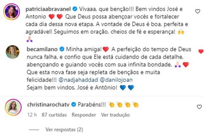 Adiante, outros artistas comentaram: “Deus é com vocês!“, enfatizou o jornalista Edu Ribeiro, da Record. “Parabéns“, escreveu Christina Rocha. “Minha amiga! A perfeição do tempo de Deus nunca falha, e confio que Ele está cuidando de cada detalhe, abençoando e guiando vocês com sua infinita bondade. Que esta nova fase seja repleta de bençãos e muita felicidade!!! @nadjahaddad @danilojoan. Sejam bem vindos, José e Antônio! Vocês são muito amados!!!!!“, reagiu Beca Milano.