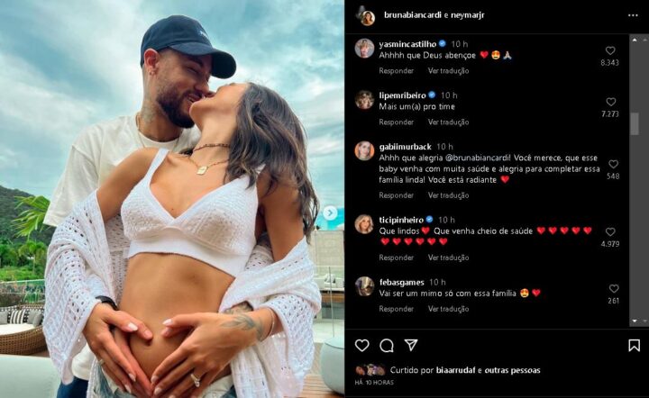 Na sequência, o casal pontuou que a criança terá uma família linda e estão ansiosos para a chegada da mesma. Eles continuam: ”Você vai chegar em uma família linda, com irmão, avós, titios e titias que já te amam muito! Vem logo filho(a), estamos ansiosos por voce!”. Por fim, Neymar e Bruna compartilharam um trecho da bíblia que fala sobre concepção: ”“Antes de formá-lo no ventre eu o escolhi; antes de você nascer, eu o separei” – Jeremias 1:5””. Vale lembrar que a nova mamãe do pedaço está grávida de poucas semanas e ainda não sabe qual o sexo do bebê.