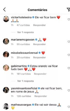 Outra que também comentou na postagem foi Yasmim Santos: “Ele vai sair dessa, em nome de Jesus. Gabi Martins: “Estou orando, vais ficar tudo bem, Marcela Mc Gowan, “Orem por favor”.