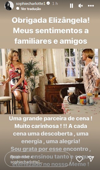 Sophie Charlotte usou os stories para se despedir da atriz. “Obrigada Elizângela! Meus sentimentos a familiares e amigos. Uma grande parceira de cena, muito carinhosa! A cada cena uma descoberta, uma energia, uma alegria! Sou grata por esse encontro que me ensinou tanto e segue eternizado em nosso meme”, escreveu Sophie, lembrando um episódio da carreira da dupla.