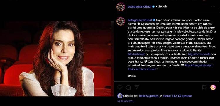 Beth Goulart também comentou a luta da atriz contra o câncer. “Hoje nossa amada Françoise Forton virou estrela 🌟 Descansou de uma luta interminável contra um câncer, ela foi uma guerreira. Deixou para nós sua história de vida de amor a arte de representar nos palcos e na televisão. Fez parte da história de todos nós que acompanhamos seus trabalhos inesquecíveis, com seu talento, seu sorriso largo e coração grande”, disse.