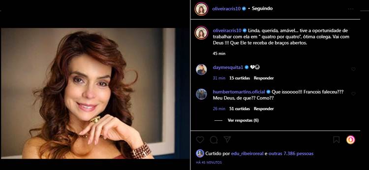 Cristiane Oliveira encheu a colega de elogios. “Linda, querida, amável… tive a oportunidade de trabalhar com ela em “quatro por quatro”, ótima colega. Vai com Deus !!! Que Ele te receba de braços abertos”, disse.