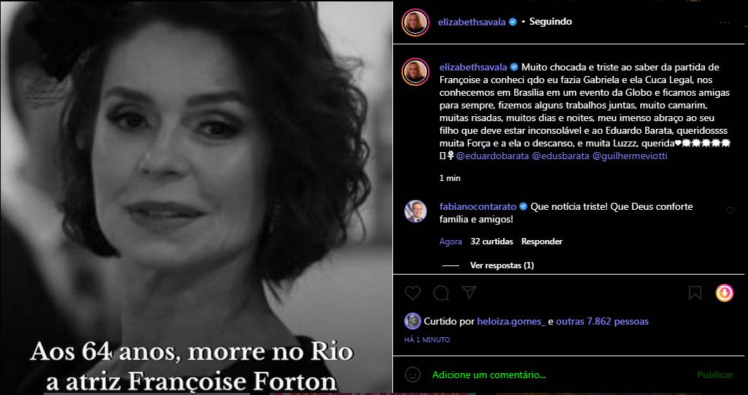 Elizabeth Savala ficou bem abalada. “Muito chocada e triste ao saber da partida de Françoise a conheci qdo eu fazia Gabriela e ela Cuca Legal, nos conhecemos em Brasília em um evento da Globo e ficamos amigas para sempre, fizemos alguns trabalhos juntas, muito camarim, muitas risadas, muitos dias e noites, meu imenso abraço ao seu filho que deve estar inconsolável e ao Eduardo Barata, queridossss muita Força e a ela o descanso, e muita Luzzz, querida”, escreveu.