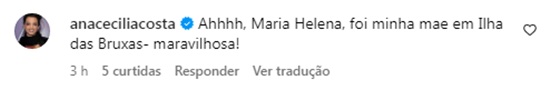 Nos comentários do post, alguns famosos aproveitaram para lamentar a morte da atriz. “Grande atriz e colega, descanse em paz”, escreveu Glória Pires.  “Ahhhh, Maria Helena, foi minha mãe em Ilha das Bruxas- maravilhosa!”, lembrou Ana Cecília Costa.