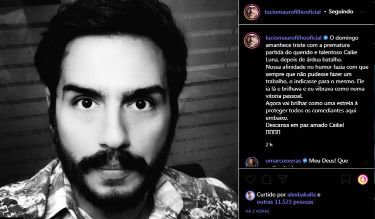 Lucio Mauro Filho foi outra artista a lamentar a perda. “O domingo amanhece triste com a prematura partida do querido e talentoso Caike Luna, depois de árdua batalha. Nossa afinidade no humor fazia com que sempre que não pudesse fazer um trabalho, o indicasse para o mesmo. Ele ia lá e brilhava e eu vibrava como numa vitoria pessoal. Agora vai brilhar como uma estrela á proteger todos os comediantes aqui embaixo. Descansa em paz amado Caike!”, escreveu.