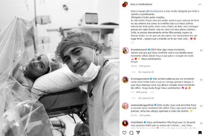 “Meus sentimentos! Muita força Lexa. Eu também perdi meu primeiro bebê quando eu estava de 5 meses. Mas Deus sabe de todas as coisas. Já, já você estar novamente grávida e terá muitas bençãos maravilhosas na sua vida. Fique bem”, expressou Ticiane Pinheiro. “Força Lexa e família. Não consigo imaginar o tamanho da dor de vocês. Meus sentimentos Deus sabe de todas as coisas, confia nele”, declarou Virginia Fonseca.