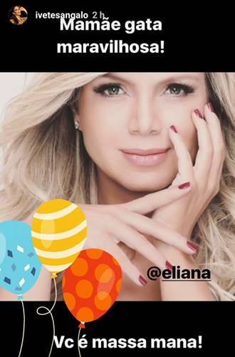 “Oi @eliana!!! Passando pra dizer que eu não esqueci que seu dia foi hoje. E quero te desejar as melhores coisas sempre! Você é um exemplo de mulher, mãe, apresentadora e muita gente sabe disso. Muito obrigada por ter me dado um presente tão lindo como o pipoca, de verdade. Você faz parte da minha história há muitos anos! Você é demais! Parabéns por tudo, muitas bênçãos hoje e sempre! Beijos“, Maisa.