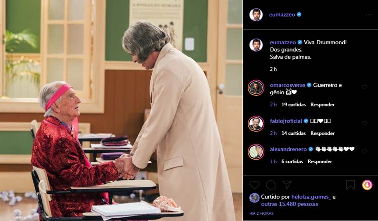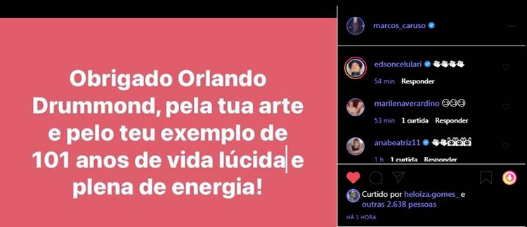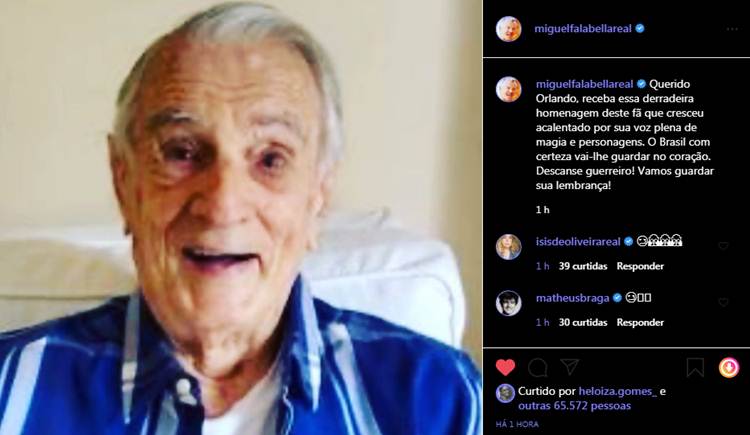 Miguel Falabella também prestou uma homenagem a Drummond. “Querido Orlando, receba essa derradeira homenagem deste fã que cresceu acalentado por sua voz plena de magia e personagens. O Brasil com certeza vai-lhe guardar no coração. Descanse guerreiro! Vamos guardar sua lembrança!“, escreveu na legenda.