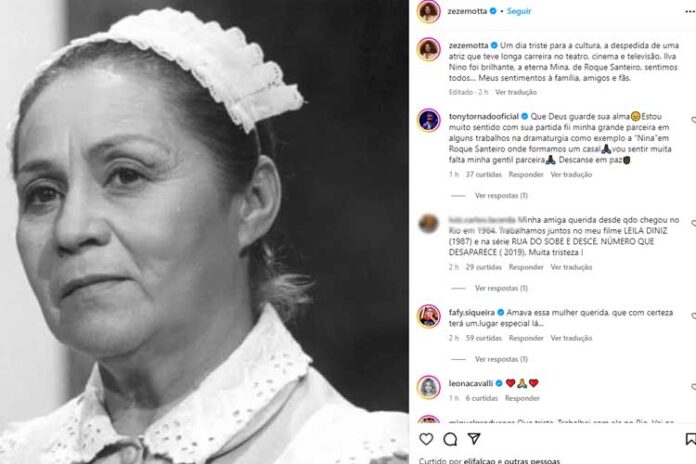 Tony Tornado comentou a publicação e disse que a atriz foi sua grande parceira. Ambos trabalharam juntos em “Cama de Gato”. “Que Deus guarde sua alma. Estou muito sentido com sua partida, foi minha grande parceira em alguns trabalhos na dramaturgia, como por exemplo, a ‘Nina’ em Roque Santeiro, onde formamos um casal. Vou sentir muita falta da minha gentil parceira. Descanse em paz”, escreveu.
