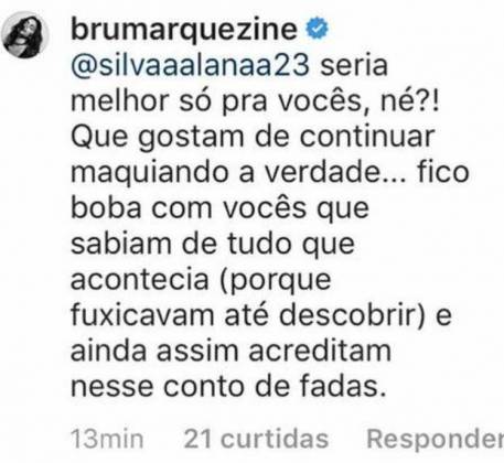 Alguns seguidores resolveram mandar mensagens para amigos mais próximos de Marquezine, querendo saber o que eles poderiam fazer para os dois voltarem. Marquezine então, perdeu a paciência, e quando um fã comentou que seria melhor ela voltar para Neymar, a artista respondeu: